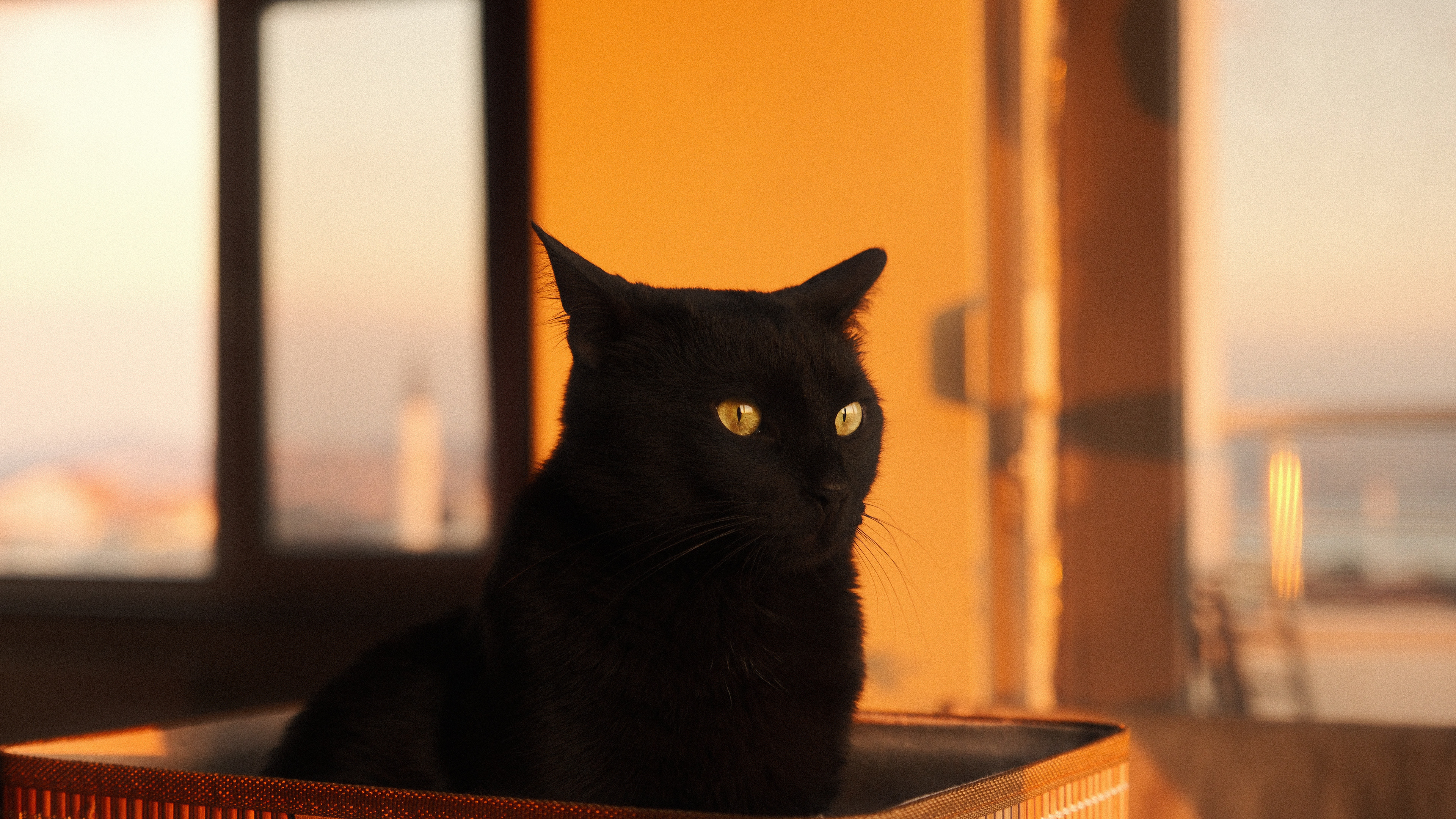 A black cat watching sunset.